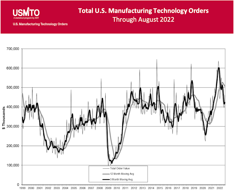 “Despite the positive signs, the last quarter of the year will present a challenge for the industry. Easing of supply chain pressures is not happening symmetrically. Inventories of durable goods components have been increasing steadily since September 2020, while certain supply bottlenecks are holding up the delivery of machines already ordered. We haven’t begun to see any significant increase in cancellations, but long lead times coupled with a potential economic slowdown could pose a threat to sustained order activity in the last quarter of 2022 and into the first half of 2023."