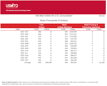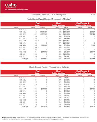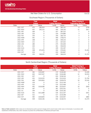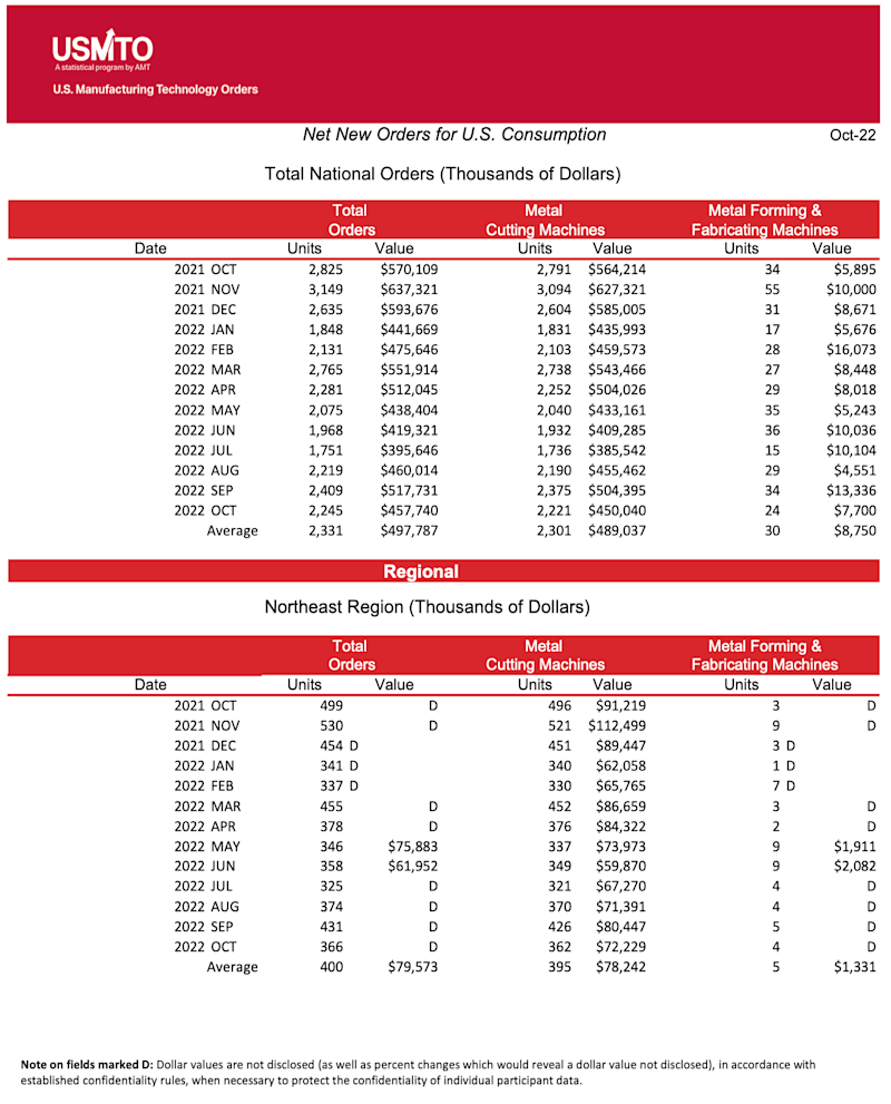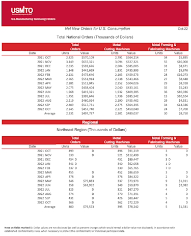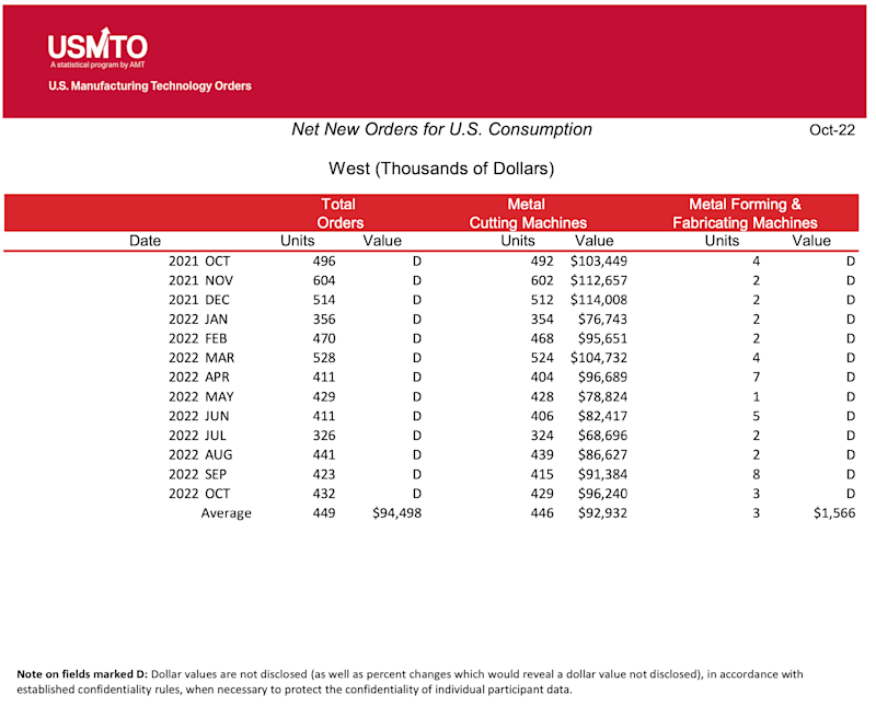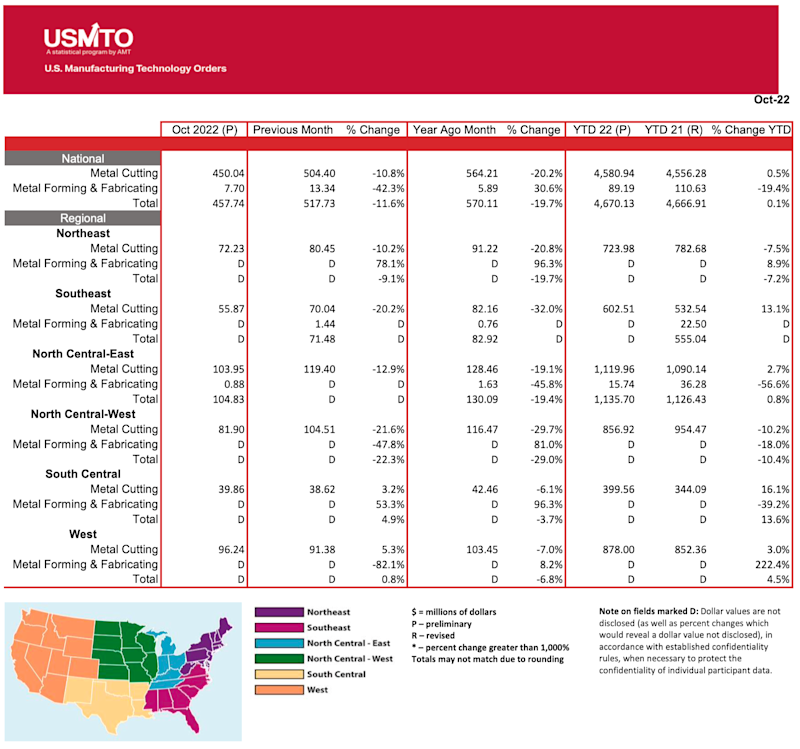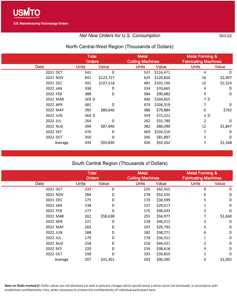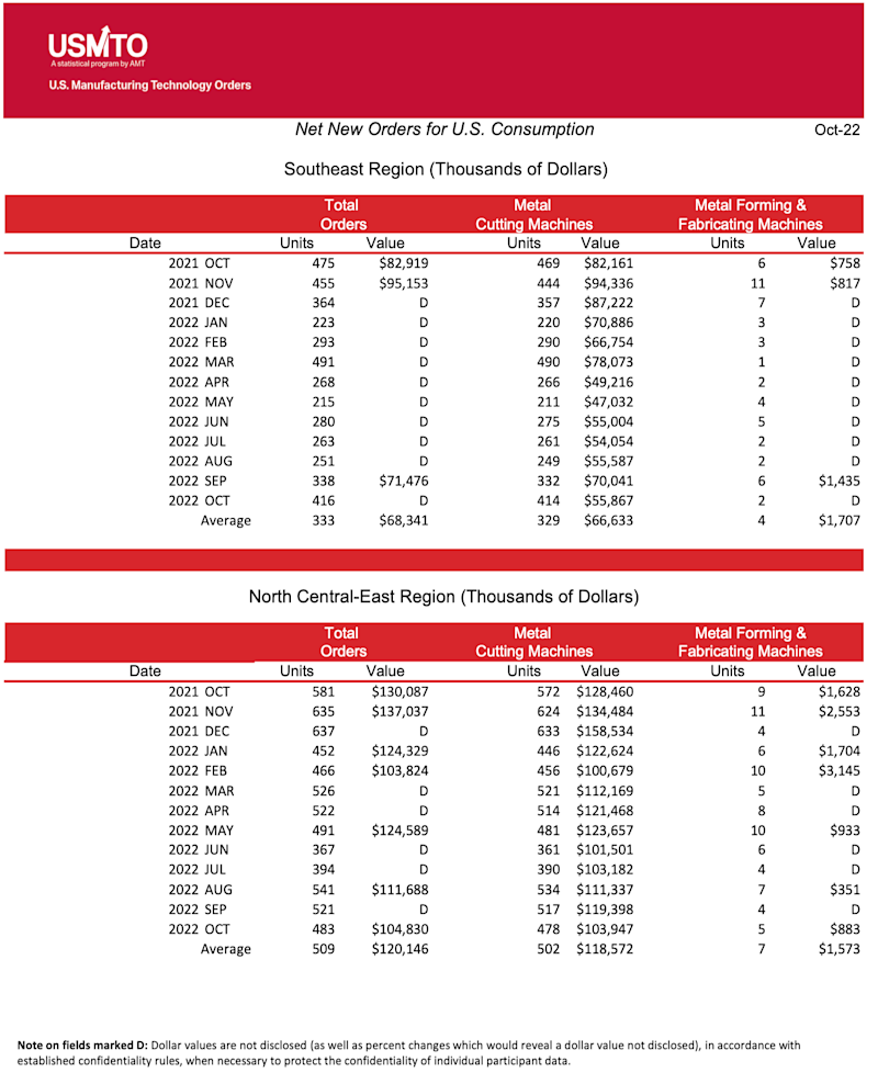The United States Manufacturing Technology Orders (USMTO) Report is based on the totals of actual data reported by companies participating in the USMTO program. This report, compiled by AMT – The Association For Manufacturing Technology, provides regional and national U.S. orders data of domestic and imported machine tools and related equipment. Analysis of manufacturing technology orders provides a reliable leading economic indicator as manufacturing industries invest in capital metalworking equipment to increase capacity and improve productivity.