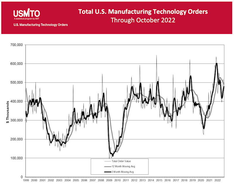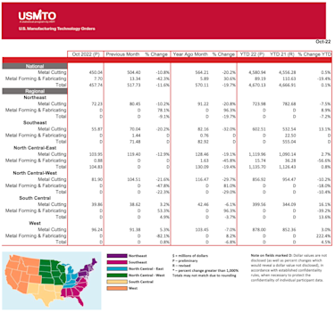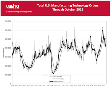 McLean, Va. (December 12, 2022) – New orders of manufacturing technology totaled $457.7 million in October 2022, according to the latest U.S. Manufacturing Technology Orders Report published by AMT – The Association For Manufacturing Technology. October 2022 orders were 20% below October 2021 and 12% lower than September 2022, the smallest decline in orders from an IMTS September ever recorded. Orders are nearly even with this point in 2021, roughly $4 million above the YTD total in October 2021.