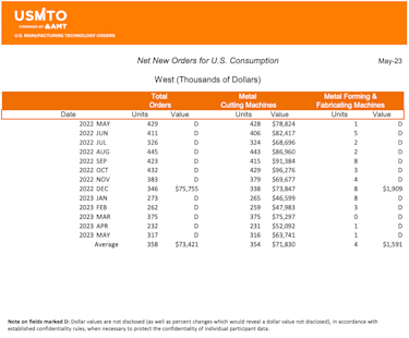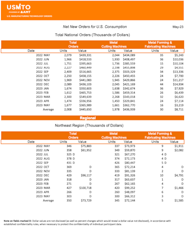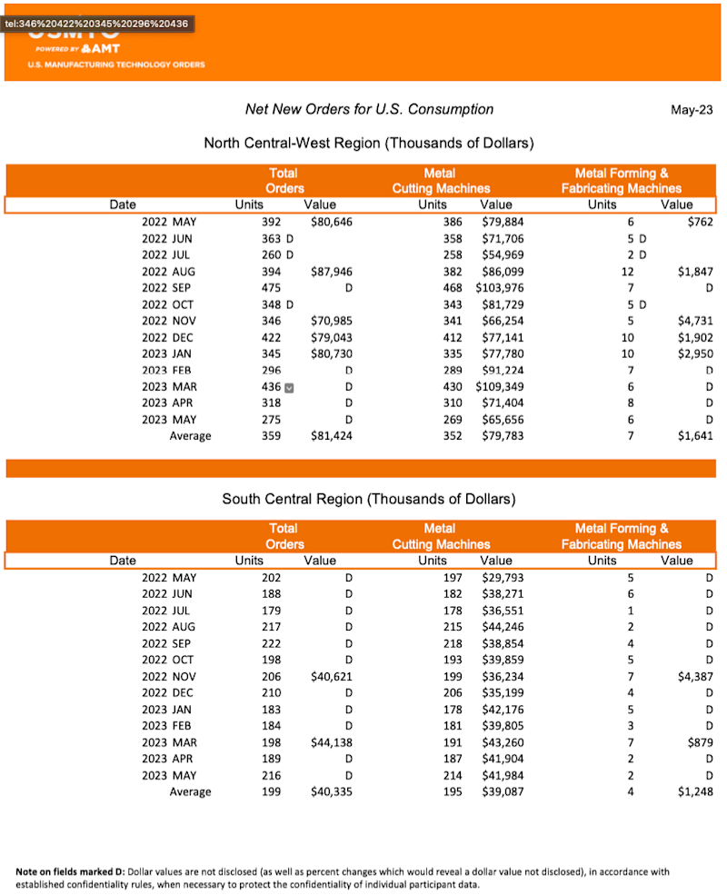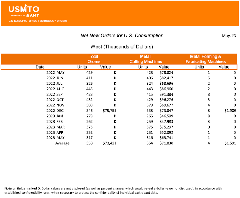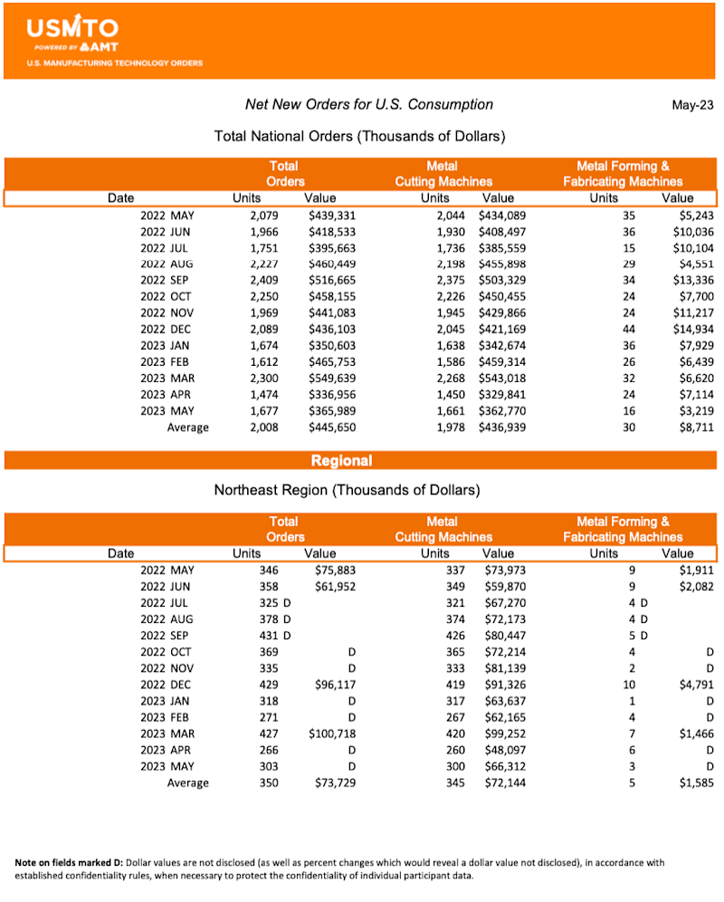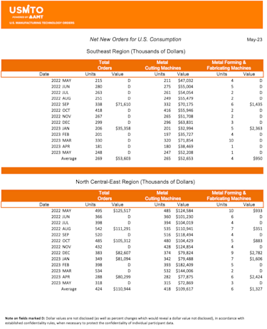 The United States Manufacturing Technology Orders (USMTO) Report is based on the totals of actual data reported by companies participating in the USMTO program. This report, compiled by AMT – The Association For Manufacturing Technology, provides regional and national U.S. orders data of domestic and imported machine tools and related equipment. Analysis of manufacturing technology orders provides a reliable leading economic indicator as manufacturing industries invest in capital metalworking equipment to increase capacity and improve productivity.