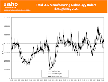 McLean, Va. (July 10, 2023) — New orders of manufacturing technology totaled $365.9 million in May 2023, according to the latest U.S. Manufacturing Technology Orders Report published by AMT – The Association For Manufacturing Technology. May orders increased 8.6% over April 2023 but fell short of May 2022 orders by 16.7%. Annual orders for 2023 increased to $2.1 billion, nearly 15% behind orders for the same period in 2022.