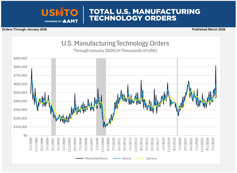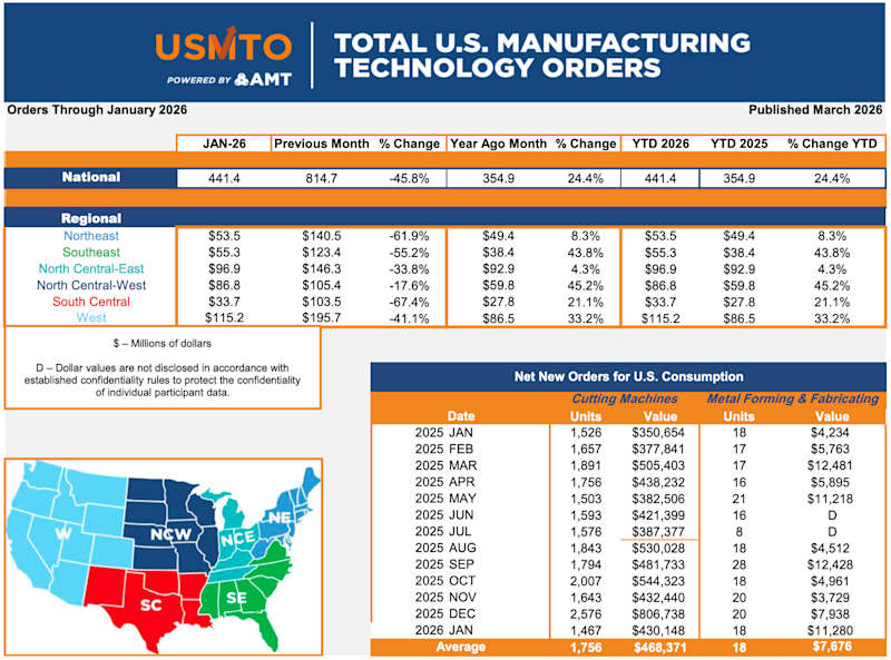 McLean, Va. (March 9, 2026) — New orders of metalworking machinery, measured by the U.S. Manufacturing Technology Orders Report published by AMT – The Association For Manufacturing Technology, totaled $441.4 million in January 2026. This was a decline of 45.8% from December 2025’s record high and an increase of 24.4% over January 2025. The number of units ordered in January 2026 fell to the lowest level since July 2024, near the trough following the post-COVID peak.