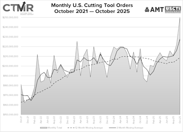 McLean, Va. (December 19, 2025) — Shipments of cutting tools, measured by the Cutting Tool Market Report, a collaboration between AMT – The Association For Manufacturing Technology and the U.S. Cutting Tool Institute (USCTI), totaled $250.1 million in October 2025. Orders increased 12.7% from September 2025 and 14.7% from October 2024. Year-to-date shipments trended positively for the first time this year and totaled $2.13 billion, up 0.6% from the same period in 2024.