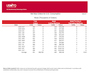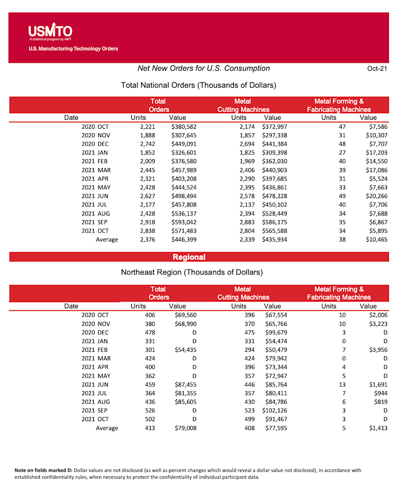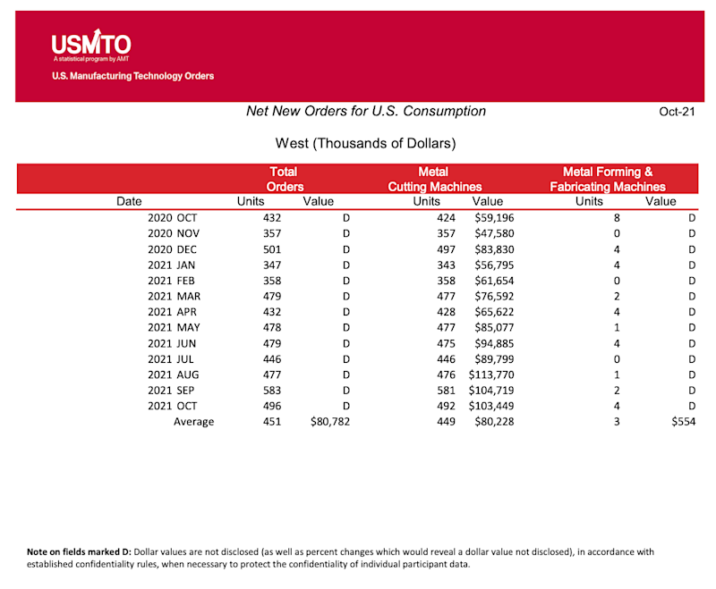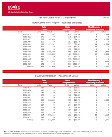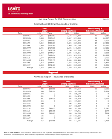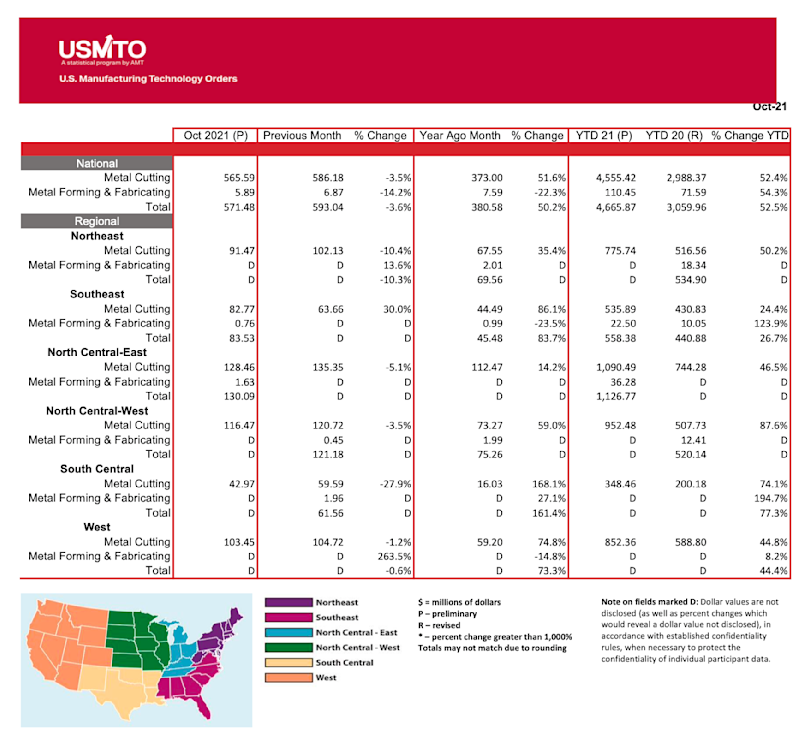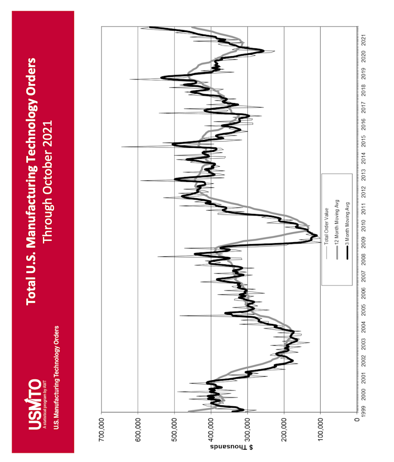 McLean, Va. (December 13, 2021) – New orders of manufacturing technology totaled $571.5 million in October 2021, according to the latest U.S. Manufacturing Technology Orders Report published by AMT – The Association For Manufacturing Technology. October orders declined 3.6% from September 2021 but increased by 50.2% over October 2020. Total orders in 2021 nearly reached $4.7 billion, a 53% increase over 2020. The three consecutive months ending in October totaled $1.7 billion, the largest three-month total since April 1998.
