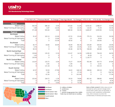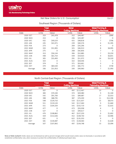 The U.S. manufacturing technology market growth rate of 53% over 2020 levels is outstanding. It is particularly exciting because the critical component producers and industries hit hard by offshoring in the 1990s are driving this expansion through dramatic investments to expand U.S.-based capacity. These industries increased capital expenditure investment by multiples of previous years, far exceeding October’s market mean of 53%. The current level of manufacturing technology orders signals a start of manufacturers reinvesting in American-based production and strengthening of U.S. manufacturers’ supply chains.