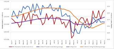 The graph below includes the 12-month moving average for the durable goods shipments and cutting tool orders. These values are calculated by taking the average of the most recent 12 months and plotting them over time.