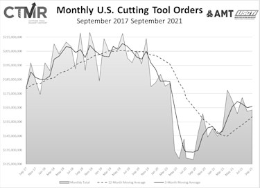 McLean, Va., (November 11, 2021) – September 2021 U.S. cutting tool consumption totaled $163.1 million, according to the U.S. Cutting Tool Institute (USCTI) and AMT – The Association For Manufacturing Technology. This total, as reported by companies participating in the Cutting Tool Market Report collaboration, was down 0.2% from August's $163.5 million and up 10.7% when compared with the $147.4 million reported for September 2020. With a year-to-date total of $1.5 billion, 2021 is up 7.4% when compared to the same time period in 2020.