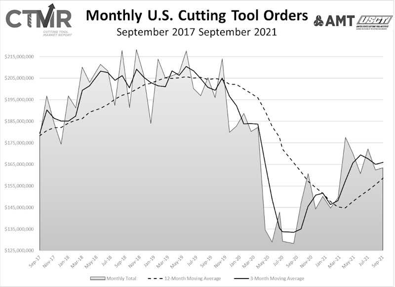 Greg Daco, chief U.S. economist at Oxford Economics USA, commented, “Following a summer lull in which rising COVID infections and growing supply chain disruptions weighed on activity, the outlook for cutting tools appears to be brightening. In September, cutting tool shipments were 11% year-over-year higher than in 2020, in line with total durable goods shipments, up 9.2% year over year. Still, year-to-date, cutting tool shipments remained 21% below their 2019 level.” He continued, “The U.S. economy lost some luster this summer, but demand appears resilient in the face of lingering supply-chain disruptions. With the health situation having improved considerably over the past few weeks, consumer spending is firming, and high-frequency data points to an acceleration in employment growth. The combination of rebounding global growth and increased government infrastructure investment should further contribute to the sectoral tailwinds in 2022.”