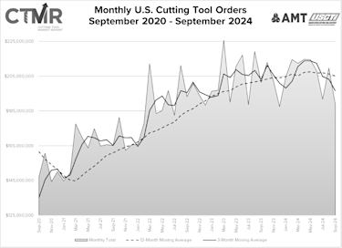“Despite the success and positive energy from IMTS for most exhibitors in Chicago, tooling continues to track at a slower pace,” noted Jack Burley, chairman of AMT’s Cutting Tool Product Group. “Staying consistent with the latest Purchasing Manager’s Index of less than 50, cutting tool consumption is still quite flat, indicating most shops are not running at full capacity. Inflation, interest rates, raw material costs, and pre-election uncertainty put many projects on hold. I do not think we will see any significant improvements until after the first quarter of 2025, when spindle utilization is expected to increase.”