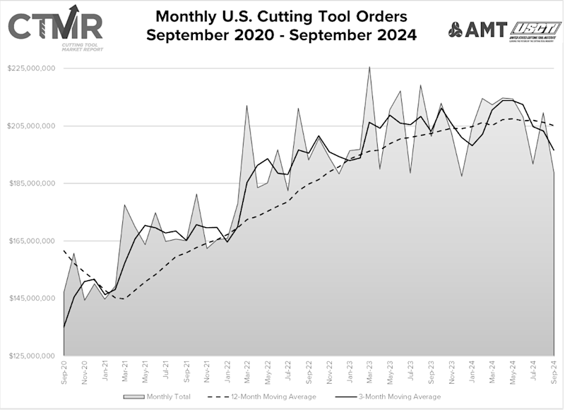McLean, Va. (November 21, 2024) — Shipments of cutting tools, measured by the Cutting Tool Market Report compiled in a collaboration between AMT – The Association For Manufacturing Technology and the U.S. Cutting Tool Institute (USCTI), totaled $188.7 million in September 2024. Orders decreased 10% from August 2024 and were down 6.3% from September 2023. Year-to-date shipments totaled $1.86 billion, up 0.7% from shipments made in the first nine months of 2023. The year-to-date growth rate has declined every month since April 2024.