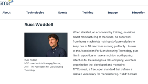 “The second perspective was in the area which Russ has taken on such a key leadership role, specifically MTConnect. The fact that top industry talent like Russ – and two other individuals also being honored this year in SME’s top 25 – are connected to the world’s first free, open, interoperability standard for the manufacturing technology industry shows the importance of open standards in accelerating the adoption and utilization of transformative technologies!”