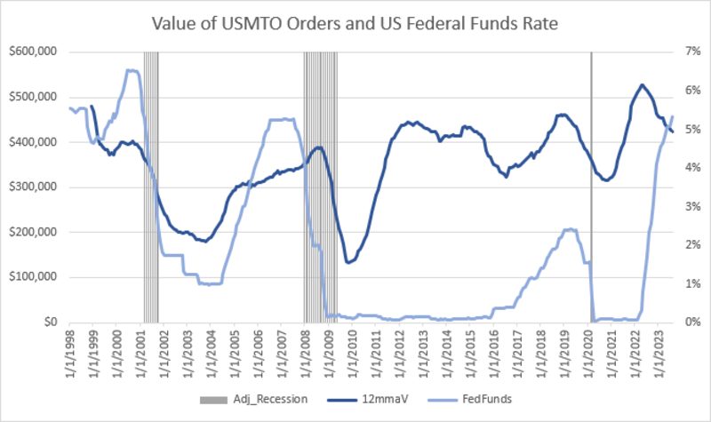 Between December 2015 and December 2018, the Fed attempted to raise rates away from the extremely accommodative 0% that had been in place since the end of the Great Recession in 2009. The period before these hikes saw inflation struggling to reach the 2% target and a surprisingly lengthy return to the pre-financial crisis trends. Both the number of units ordered and the value of orders increased nearly in tandem with the interest rate increases. This hiking cycle coincided with the end of the 2016 manufacturing recession, where orders declined, as well as the remarkable rebound that took place in 2018, which could account for the positive correlation with interest rates.