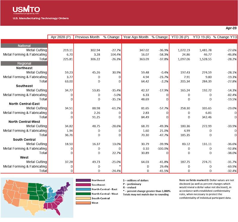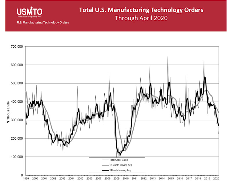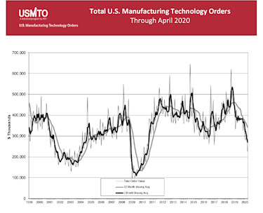 McLean, Va. (June 8, 2020) – U.S. manufacturing technology orders decreased 26% in April from the previous month to $225.8 million, the lowest monthly total since May 2010, according to the latest U.S. Manufacturing Technology Orders report published by AMT – The Association For Manufacturing Technology. New orders were 39% lower than in April 2019. Total orders through April 2020 were just shy of $1.1 billion, 28% lower than 2019 orders during the same period.