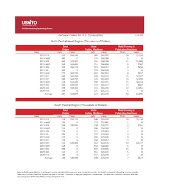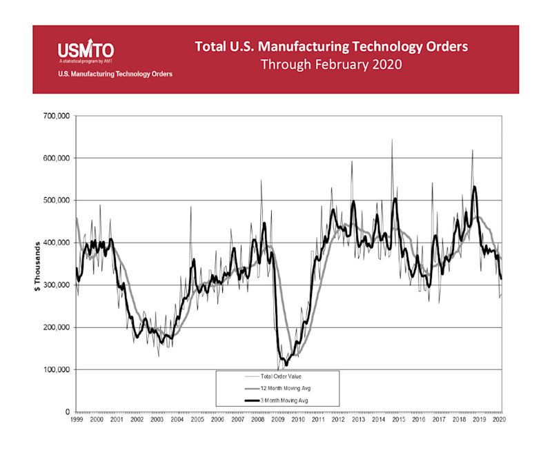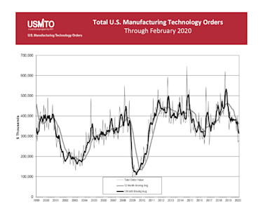 McLean, Va. (April 13, 2020) – U.S. manufacturing technology orders increased 3 percent in February from the previous month to $277.9 million, according to the latest U.S. Manufacturing Technology Orders report published by AMT – The Association For Manufacturing Technology. New orders were 16.5 percent lower than in February 2019. Total orders through February 2020 are $547 million, 26.2 percent lower than YTD 2019 orders.