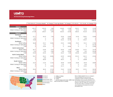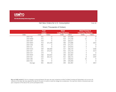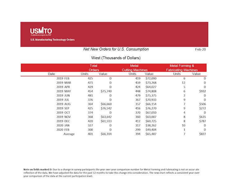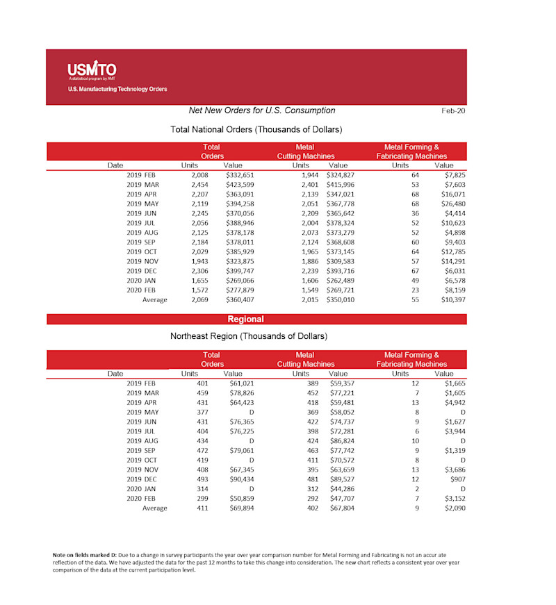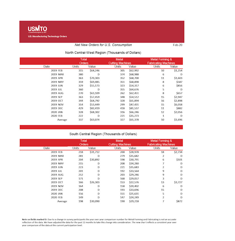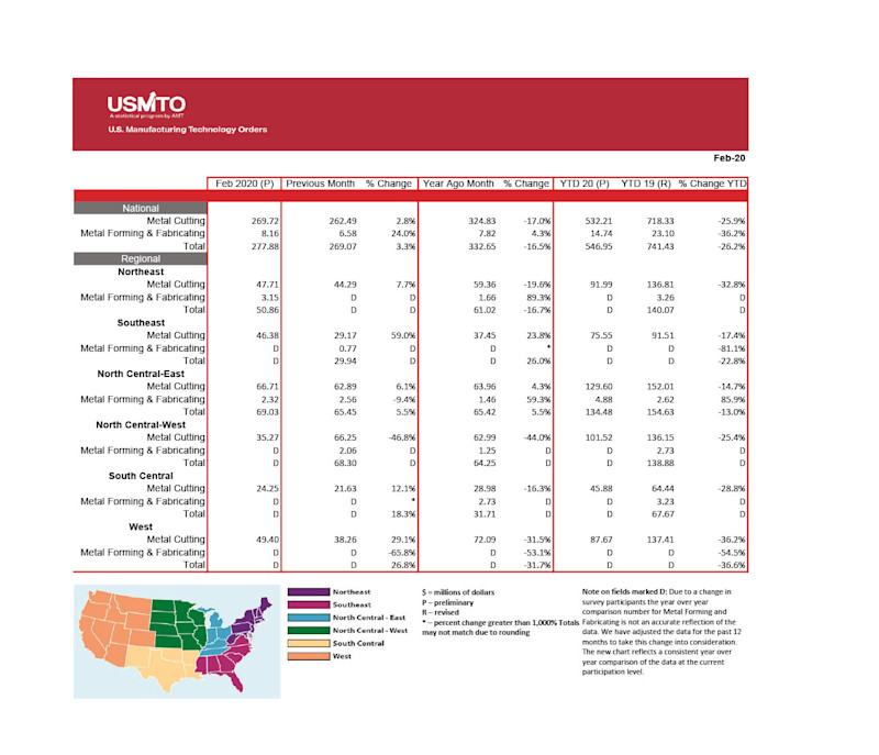 The United States Manufacturing Technology Orders (USMTO) Report is based on the totals of actual data reported by companies participating in the USMTO program. This report, compiled by AMT – The Association For Manufacturing Technology, provides regional and national U.S. orders data of domestic and imported machine tools and related equipment. Analysis of manufacturing technology orders provides a reliable leading economic indicator as manufacturing industries invest in capital metalworking equipment to increase capacity and improve productivity.