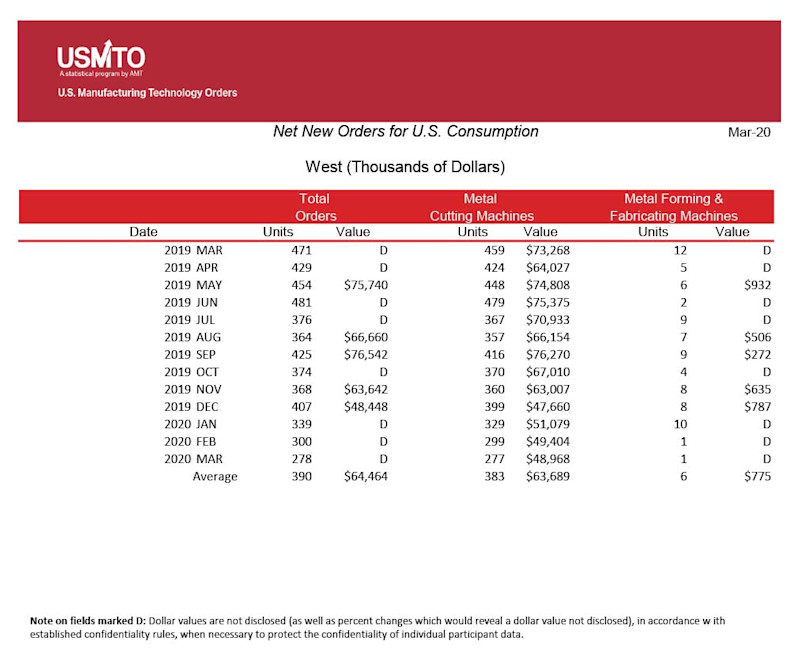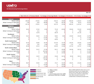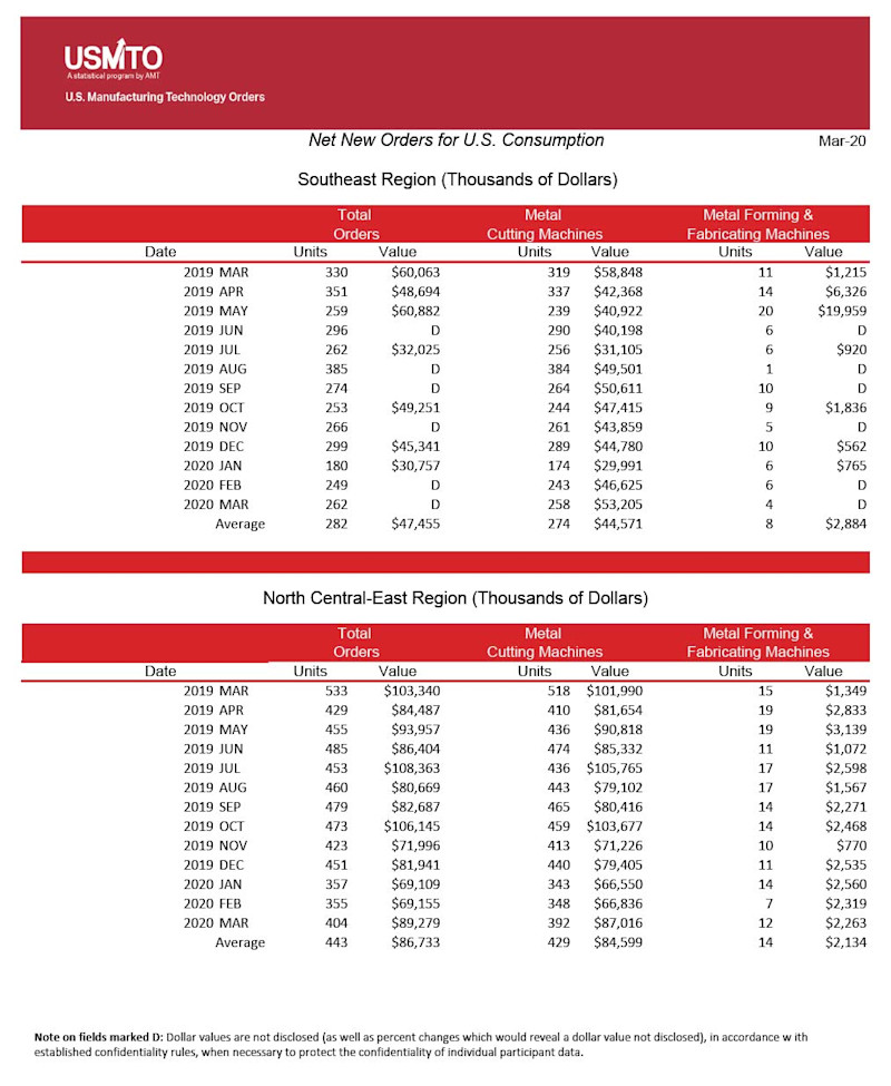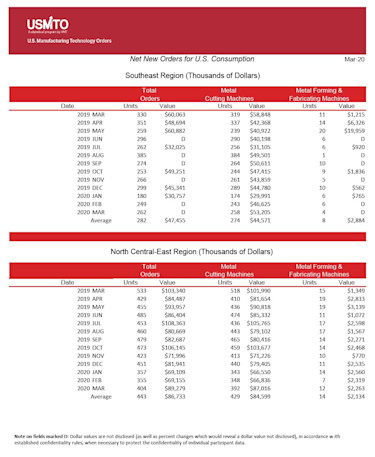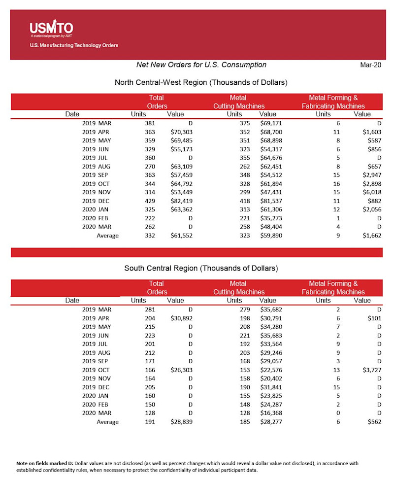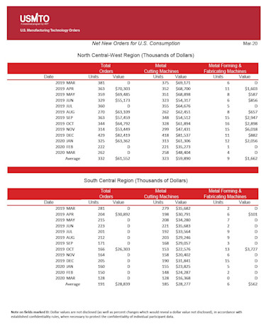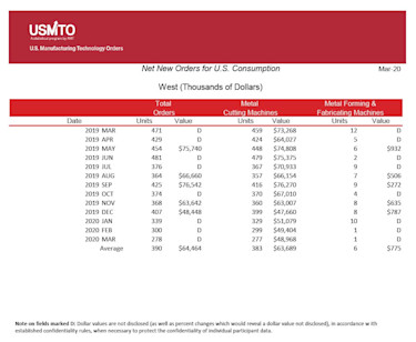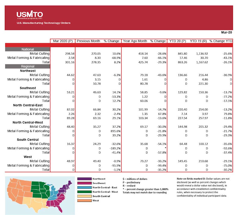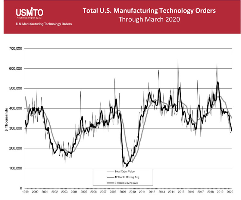 McLean, Va. (May 11, 2020) – U.S. manufacturing technology orders increased 8% in March from the previous month to $301.2 million, according to the latest U.S. Manufacturing Technology Orders report published by AMT – The Association For Manufacturing Technology. New orders were 29.3% lower than in March 2019. Total orders through March 2020 were $863 million, 26.1% lower than YTD 2019 orders. “We were anticipating an increase in orders from February since many companies’ fiscal years end in March, which typically drives up orders,” said Douglas K. Woods, president of AMT. “Yet while orders in the first half of March were fairly robust, order volume decelerated rapidly in the second half of the month as stay-at-home orders were put into place “Going forward, we expect April and May orders to be significantly impacted by the inability of salespeople to meet with new prospects and visit customers’ facilities. While videoconferencing is productive in some situations, it cannot effectively substitute for face-to-face meetings with customers at their facilities. “This drop-off in quotations is most visible in the contracting machining sector, which represents nearly a third of the manufacturing technology customer base and is seeing a 70-80% drop in new quotation activity. If this rate of decline is representative of other key sectors, then much of the industry can expect a large drop-off in order volumes in the second and third quarters. Bucking the downward trend are defense, space, and medical equipment – and there are encouraging signs that automotive is slowing scaling back up as well.”