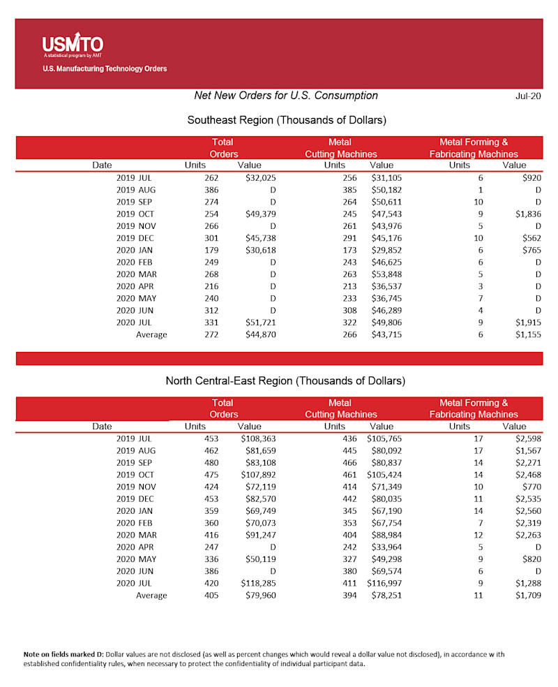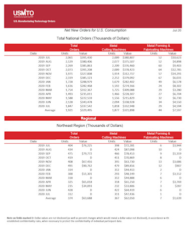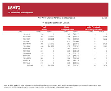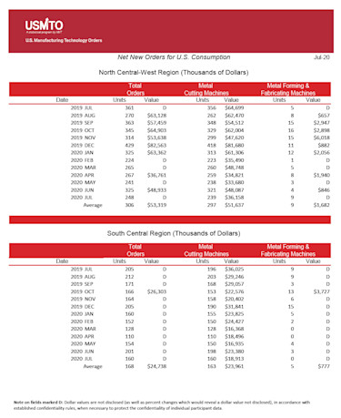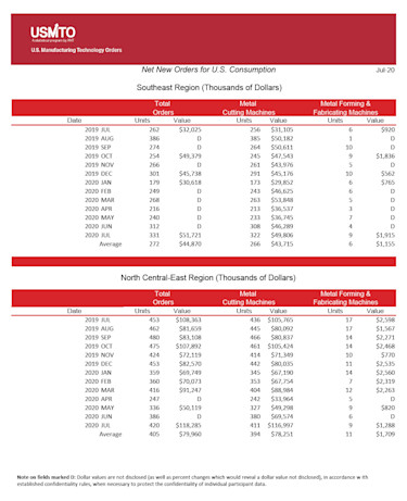 The United States Manufacturing Technology Orders (USMTO) Report is based on the totals of actual data reported by companies participating in the USMTO program. This report, compiled by AMT – The Association For Manufacturing Technology, provides regional and national U.S. orders data of domestic and imported machine tools and related equipment. Analysis of manufacturing technology orders provides a reliable leading economic indicator as manufacturing industries invest in capital metalworking equipment to increase capacity and improve productivity.