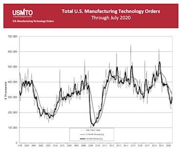 McLean, Va. (September 14, 2020) – U.S. Manufacturing Technology Orders totaled $337.5 million in July 2020, a decrease of 1.7% from June 2020 and a 13.8% decrease from July 2019, according to the latest U.S. Manufacturing Technology Orders report published by AMT – The Association For Manufacturing Technology. Orders to date reached $2 billion, nearly a quarter lower than the total through July 2019.