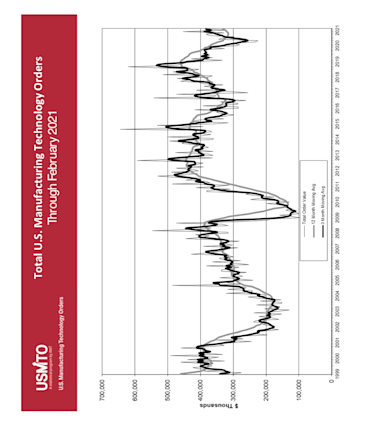 McLean, Va. (April 12, 2021) – U.S. Manufacturing Technology Orders totaled $377.6 million in February 2021, a 17.8% increase from January 2021 and a 34.2% increase over February 2020, according to the latest U.S. Manufacturing Technology Orders report published by AMT – The Association For Manufacturing Technology. The year-to-date total was $698.2 million, representing a 22.4% increase over the first two months of 2020.