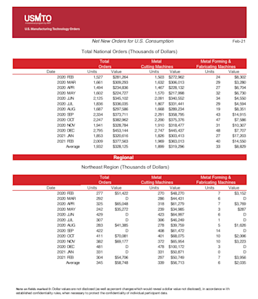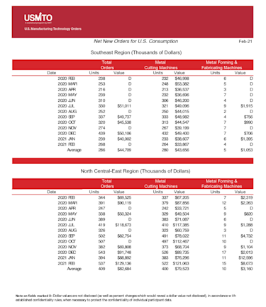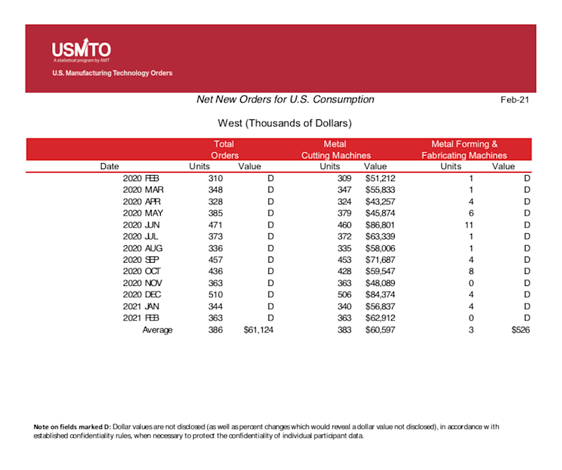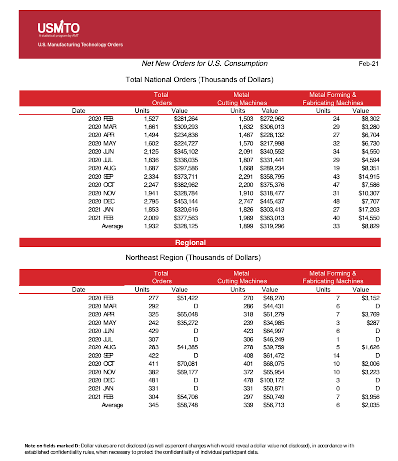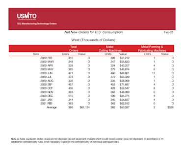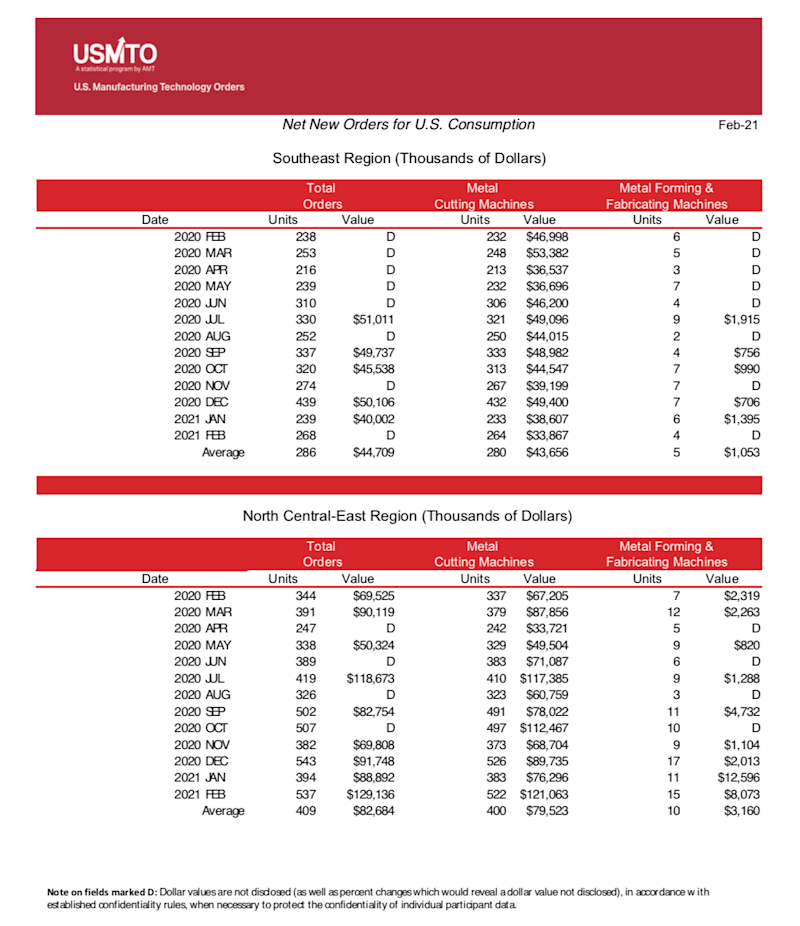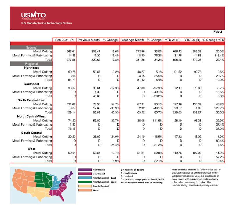 The United States Manufacturing Technology Orders (USMTO) Report is based on the totals of actual data reported by companies participating in the USMTO program. This report, compiled by AMT – The Association For Manufacturing Technology, provides regional and national U.S. orders data of domestic and imported machine tools and related equipment. Analysis of manufacturing technology orders provides a reliable leading economic indicator as manufacturing industries invest in capital metalworking equipment to increase capacity and improve productivity.