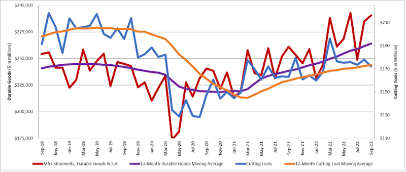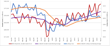 The graph below includes the 12-month moving average for the durable goods shipments and cutting tool orders. These values are calculated by taking the average of the most recent 12 months and plotting them over time.
