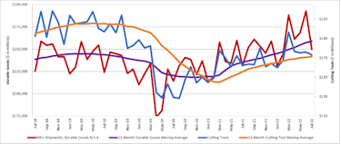 The graph below includes the 12-month moving average for the durable goods shipments and cutting tool orders. These values are calculated by taking the average of the most recent 12 months and plotting them over time.