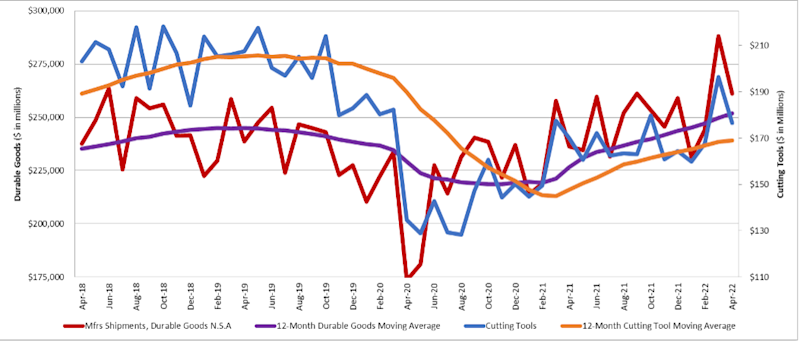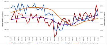 The graph below includes the 12-month moving average for the durable goods shipments and cutting tool orders. These values are calculated by taking the average of the most recent 12 months and plotting them over time.