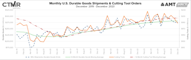 The graph below includes the 12-month moving average for the durable goods shipments and cutting tool orders. These values are calculated by taking the average of the most recent 12 months and plotting them over time.