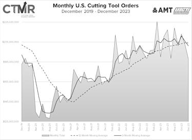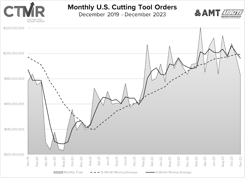 McLean, Va. (February 20, 2024) — December 2023 U.S. cutting tool consumption totaled $187.9 million, according to the U.S. Cutting Tool Institute (USCTI) and AMT – The Association For Manufacturing Technology. This total, as reported by companies participating in the Cutting Tool Market Report collaboration, was down 7.3% from November’s $202.7 million and down 0.3% when compared with the $188.4 million reported for December 2022. With a year-to-date total of $2.45 billion, 2023 is up 6.9% when compared to the same time period in 2022.