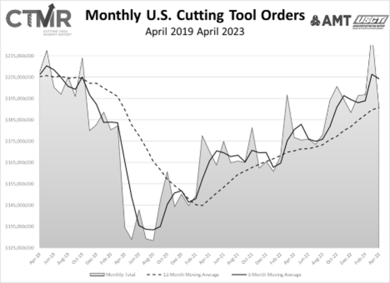 McLean, Va. (June 23, 2023) — April 2023 U.S. cutting tool consumption totaled $190.0 million, according to the U.S. Cutting Tool Institute (USCTI) and AMT – The Association For Manufacturing Technology. This total, as reported by companies participating in the Cutting Tool Market Report collaboration, was down 15.8% from March’s $225.6 million and up 7.5% when compared with the $176.7 million reported for April 2022. With a year-to-date total of $809.0 million, 2023 is up 15.2% when compared to the same time period in 2022.