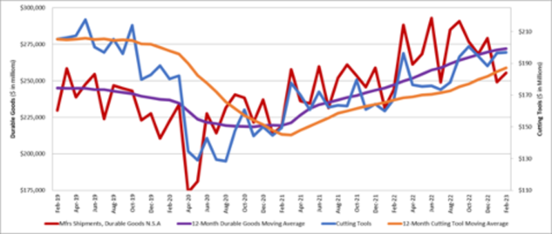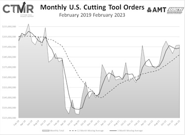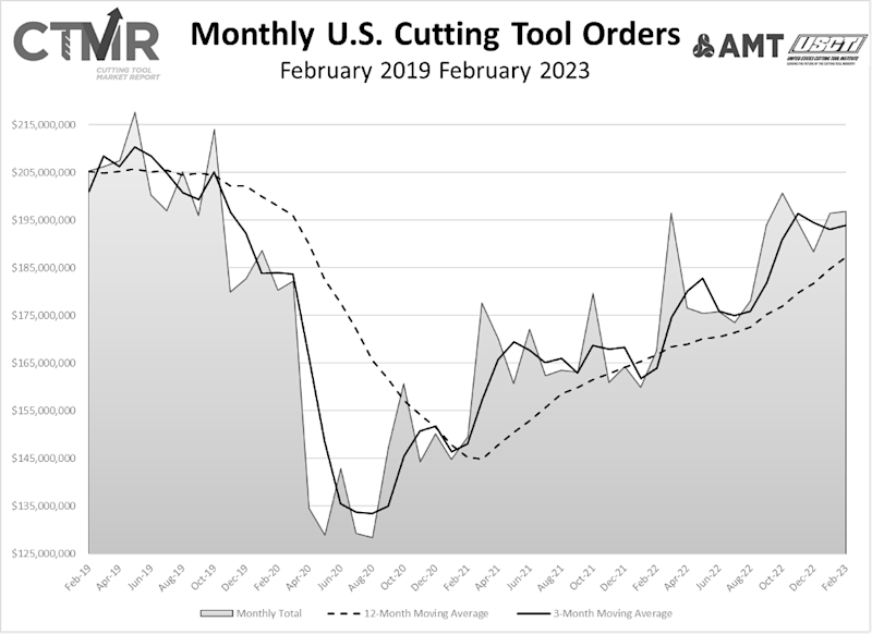 McLean, Va. (April 20, 2023) – February 2023 U.S. cutting tool consumption totaled $196.9 million, according to the U.S. Cutting Tool Institute (USCTI) and AMT – The Association For Manufacturing Technology. This total, as reported by companies participating in the Cutting Tool Market Report collaboration, was up 0.2% from January’s $196.5 million and up 17.5% when compared with the $167.6 million reported for February 2022. With a year-to-date total of $393.4 million, 2023 is up 20.1% when compared to the same time period in 2022.
