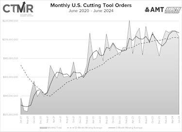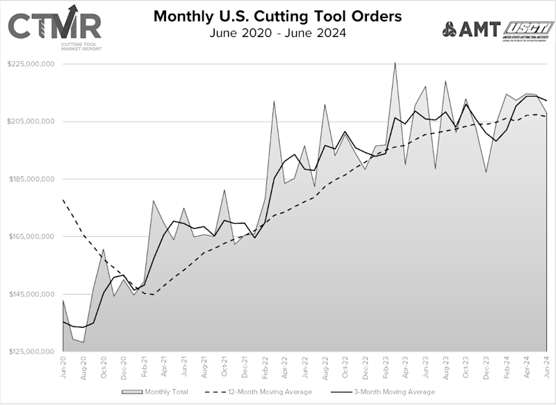 McLean, Va. (August 14, 2024) — Shipments of cutting tools, measured by the Cutting Tool Market Report compiled in a collaboration between AMT – The Association For Manufacturing Technology and the U.S. Cutting Tool Institute (USCTI), were $208.1 million in June 2024. Orders decreased 2.9% from May 2024 and were down 4.2% from June 2023. Year-to-date shipments totaled $1.27 billion, up 2.6% from shipments made in the first six months of 2023.