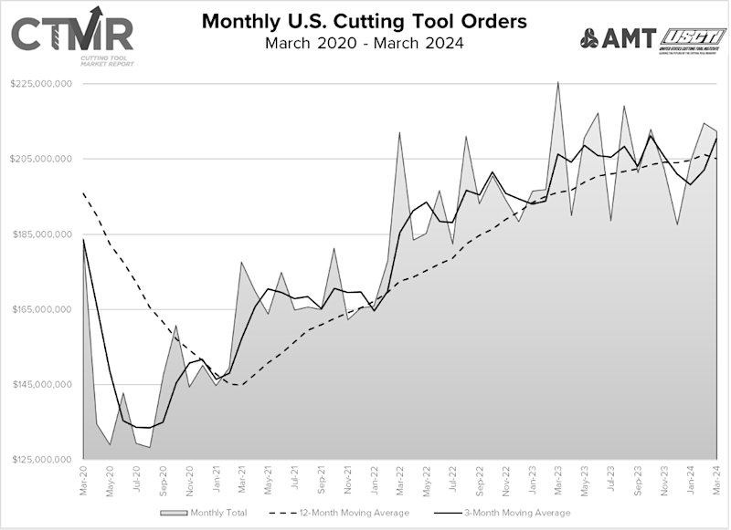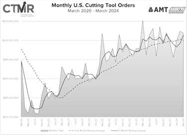 McLean, Va. (May 20, 2024) — March 2024 U.S. cutting tool consumption totaled $212.4 million, according to the U.S. Cutting Tool Institute (USCTI) and AMT – The Association For Manufacturing Technology. This total, as reported by companies participating in the Cutting Tool Market Report collaboration, was down 1.1% from February’s $214.6 million and down 5.8% when compared with the $225.6 million reported for March 2023. With a year-to-date total of $631.5 million, 2024 is up 2% when compared to the same time period in 2023.