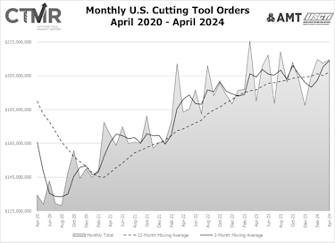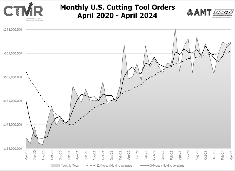 McLean, Va. (June 12, 2024) — Shipments of cutting tools, measured by the Cutting Tool Market Report compiled in a collaboration between AMT – The Association For Manufacturing Technology and the U.S. Cutting Tool Institute (USCTI), reached $214.7 million in April 2024. Orders increased 1.1% over March 2024 and grew by 13% over April 2023. Year-to-date shipments totaled $846.1 million, nearly 5% above shipments made in the first four months of 2023.