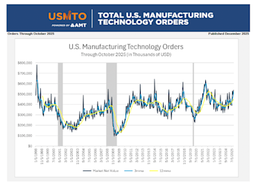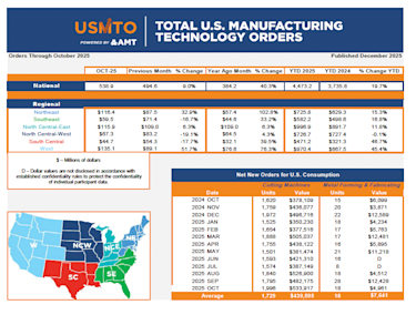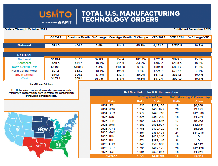 McLean, Va. (December 8, 2025) — New orders of metalworking machinery, measured by the U.S. Manufacturing Technology Orders Report published by AMT – The Association For Manufacturing Technology, totaled $538.9 million in October 2025. This was a 9% increase from September 2025 and a 40.3% increase from October 2024. Machinery orders tracked by USMTO through October 2025 totaled $4.47 billion, a 19.7% increase over the first 10 months of 2024.