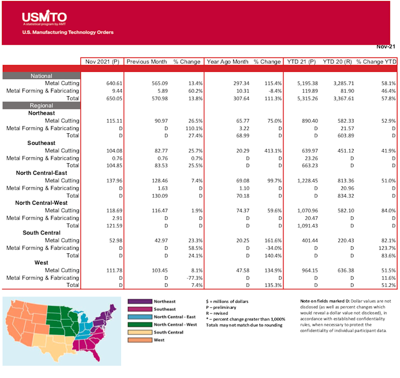 McLean, Va. (January 10, 2022) – Orders of manufacturing technology surpassed $650 million in November 2021, according to the latest U.S. Manufacturing Technology Orders Report published by AMT – The Association For Manufacturing Technology. This is the second-highest monthly total and only the fifth instance monthly orders have exceeded $600 million since the beginning of the program in 1998. The value of orders was up nearly 14% from October 2021 and more than double the value of orders received in November 2020. The year-to-date total topped $5.3 billion, about $340 million short of becoming the best year in the history of the program.