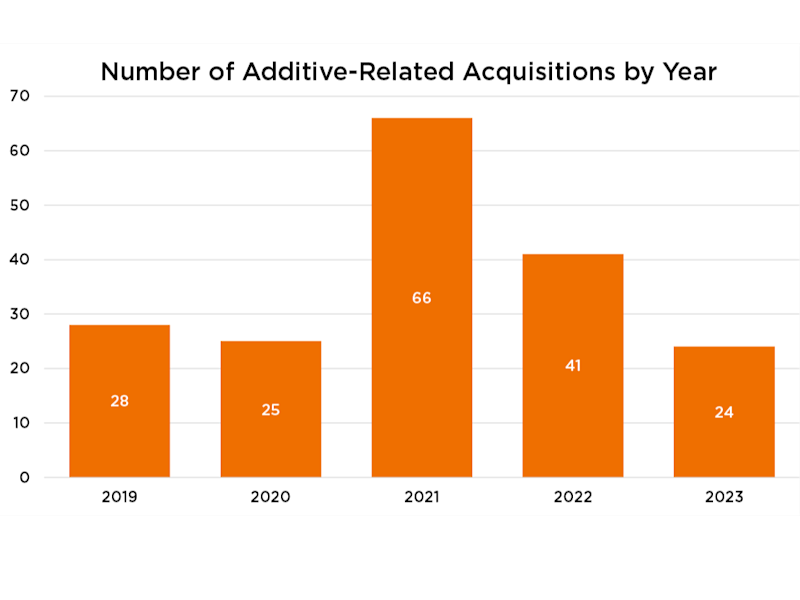 Mergers and acquisitions involving companies working in part or whole with additive manufacturing decreased from the 2021 high of 66 down to 41 transactions for 2022 and further to 24 transactions in 2023. The significant slowdown in M&A activity reflects the increased cost of capital due to rising interest rates alongside recessionary concerns and geopolitical uncertainty.